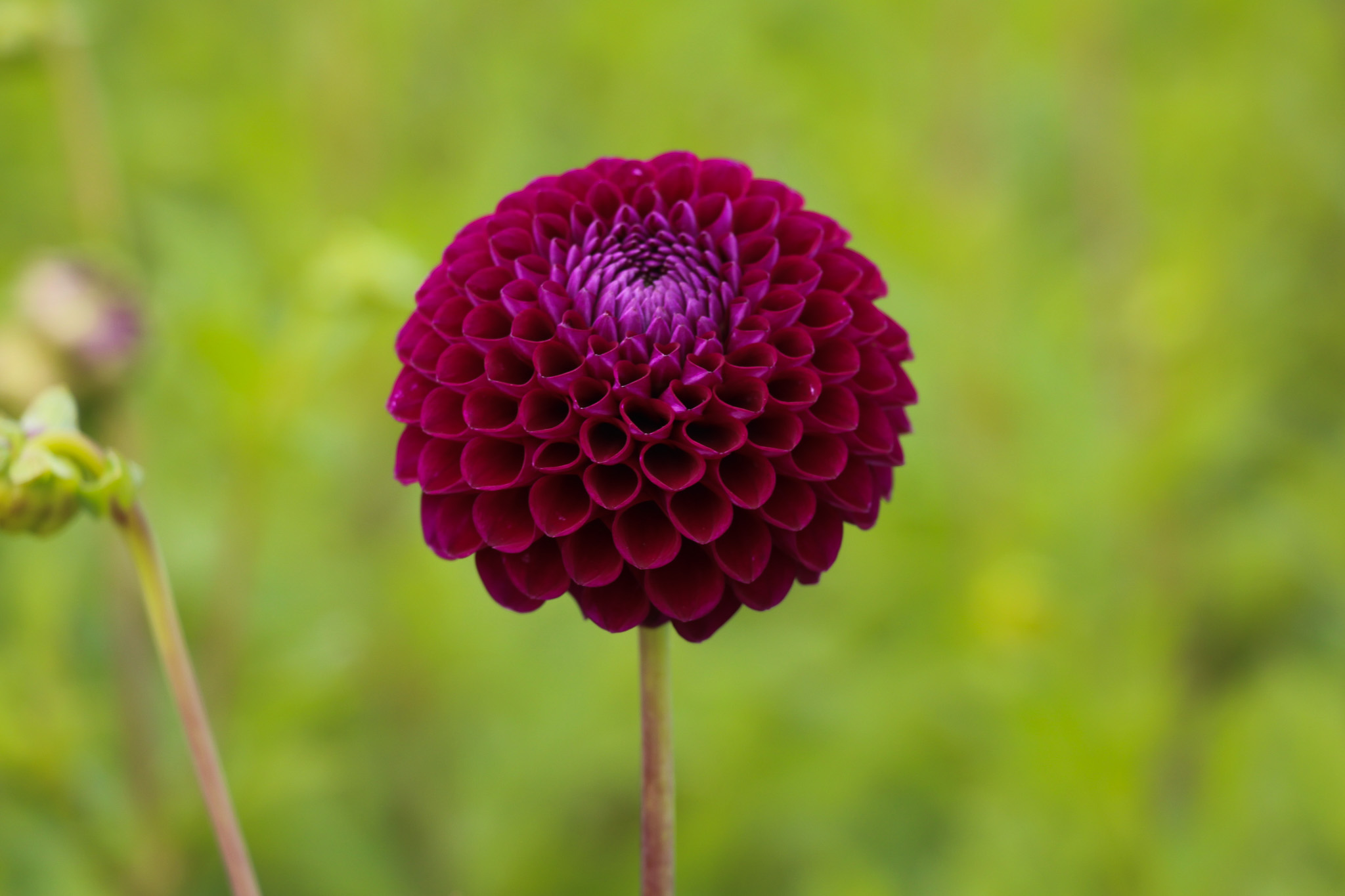 Zeer goed gevormde snijdahlia met kleine bolvormige pruimrode tot paarse bloemen. Mooi naast Dahlia ‘Blue Bayou’.
