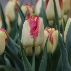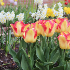 Een stevige citroengele tulp met een licht gekartelde rozerode rand. Goed voor op potten, in een vaas of gewoon in de border.