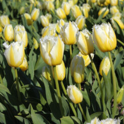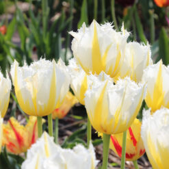 Deze tulp heeft een goed gefranjerde witte bloem met een gele vlam. Mooi in de zelfde kleur als de vroeger bloeiende fosteriana tulp ‘Sweet Valley’
