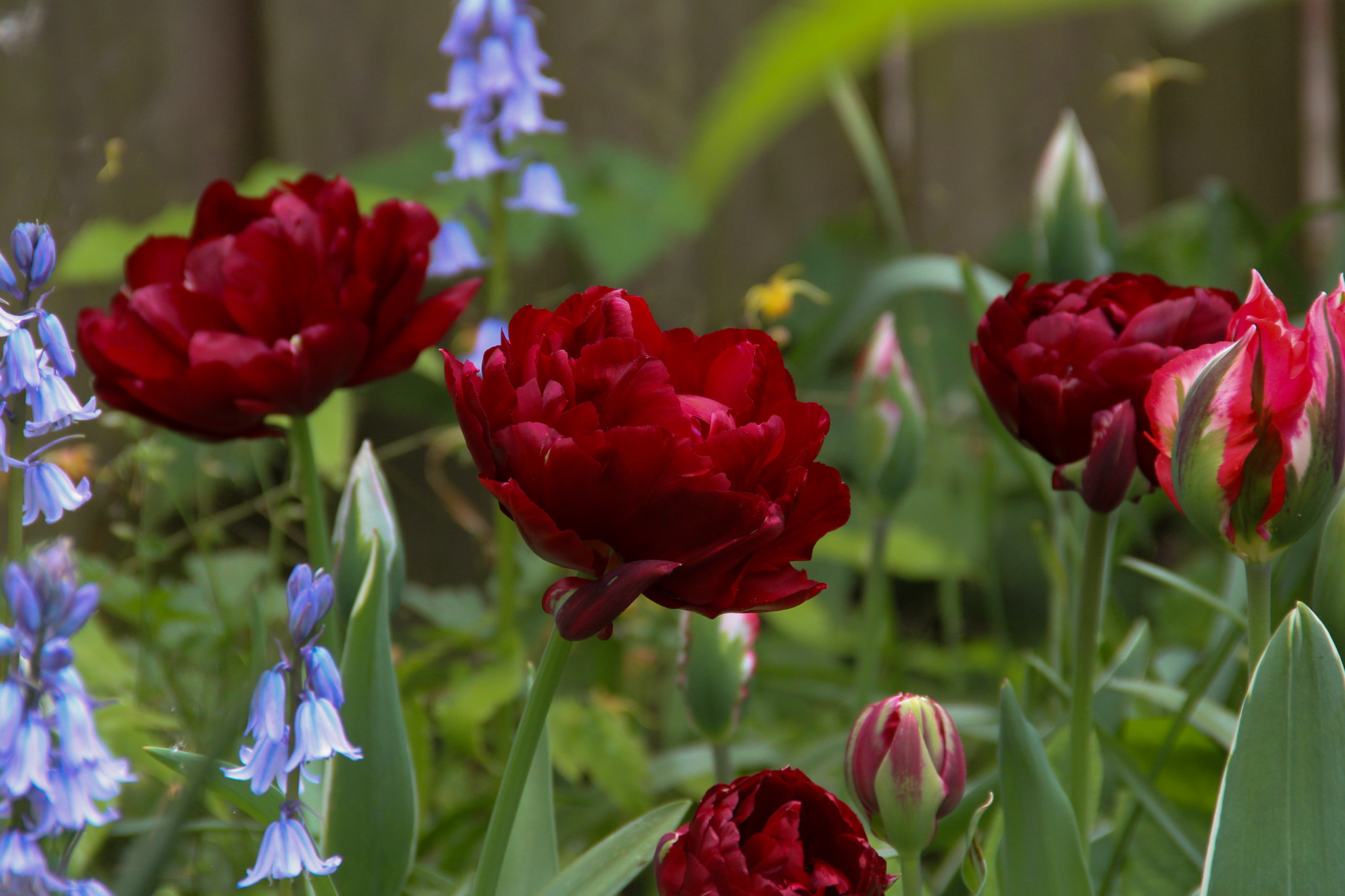 Historische, kastanje bruin-rode gevulde tulp met grote bloemen voor pot of border.